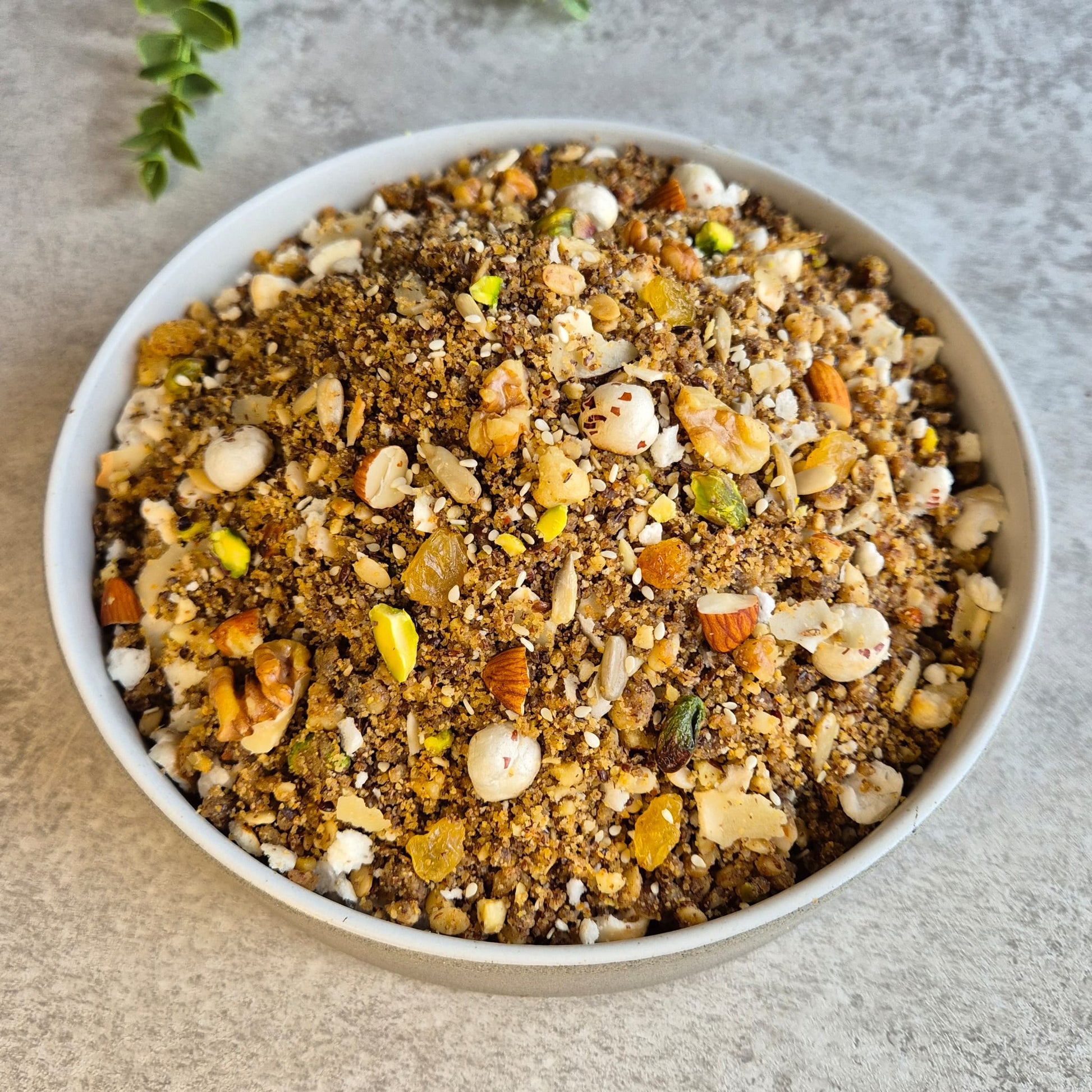Alsi (Flaxseeds), Wheat flour, Gurr (Jaggery), Pure Ghee, Almonds, Walnuts, Cashew nuts, Fox seeds (phool makhana), Raisins, Coconut, Pistachio, Melon seeds, Sunflower seeds,Sesame seeds
